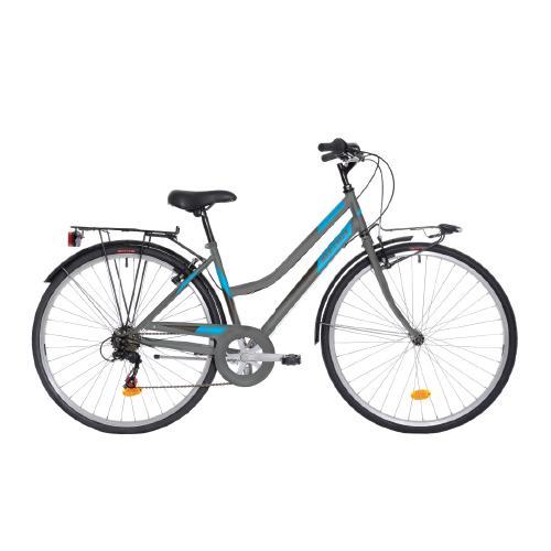La bici trekking 28 di Atala è unelegante bicicletta, appositamente progettata per lunghe passeggiate. È equipaggiata con telaio in resistente acciaio e con cambio a 6 velocità, che consente di trovare la cadenza di pedalata più adatta. Ha ruote da 28 pollici che favoriscono il supporto e laumento della velocità negli spostamenti in pianura. È dotata di parafango, carter in metallo e numerosi accessori utili: portapacchi, portacestino, impianto luci a batteria, cavalletto, campanello, rifrangenti sulle ruote.