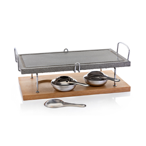 Caratteristiche: dimensioni (LxPxH) 41x23x16 cm. Materiali pietra ollare e legno. Il set comprende 5 pezzi: 2 fornelli, 1 pietra ollare, 1 base in legno, 1 supporto in metallo. Pietra ollare non lavabile in lavastoviglie. Pulire con panno imbevuto di aceto o acqua calda quando la piastra è fredda.