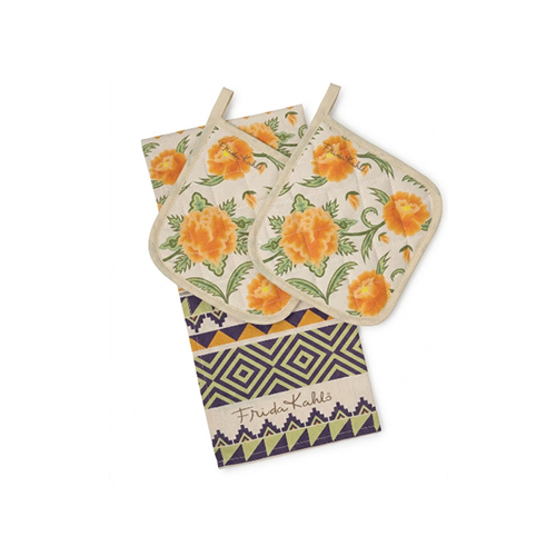 Il set cucina Frida Kahlo è un coordinato vivace e funzionale che include due presine con appendino e un canovaccio abbinato. Il canovaccio, di dimensioni 50×65 cm, è realizzato in robusto cotone da 220 gr/m2, mentre le presine, grandi 18×18 cm, sono prodotte in cotone da 200 gr/m2 e tagliate a mano. L’intero set è creato con una stampa digitale piazzata con motivi floreali e geometrici tipici dell’estetica dell’artista.