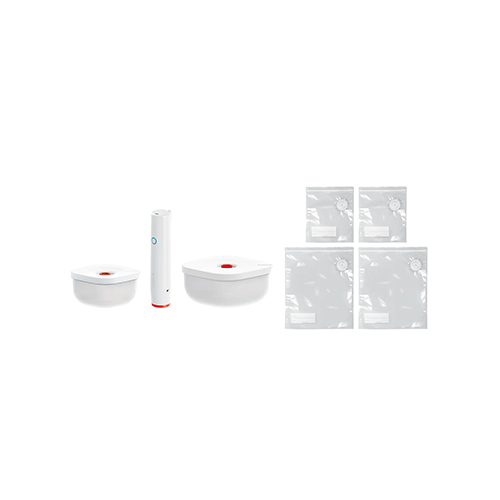Il sistema per il sottovuoto Save-It, composto di una pompa elettrica e cordless, due contenitori e due set di sacchetti, permette di conservare più a lungo la freschezza degli alimenti riducendo gli sprechi dovuti al deperimento del cibo. I contenitori, in materiale plastico pregiato, hanno un coperchio dotato di valvola in silicone per lestrazione dellaria e la pompa permette di creare il sottovuoto in sacchetti e contenitori con la semplice pressione di un tasto e si arresta automaticamente a obiettivo raggiunto. I sacchetti per sottovuoto riutilizzabili dispongono di una valvola per lestrazione dellaria e di un apposito spazio per scrivere la data di confezionamento del cibo contenuto. Sacchetti utilizzabili nel microonde, nel freezer e nel frigo.