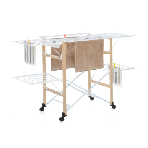 Lo stendibiancheria pieghevole di Foppapedretti, con struttura in legno massiccio di faggio verniciato allacqua, è modulabile in base alla quantità di bucato da stendere grazie ai bracci laterali e frontali indipendenti. Offre 27 metri di filo utile per stendere il bucato. Quando non serve, si chiude in pochissimo spazio, occupando solo 14 centimetri, e resta anche in piedi da solo. Si sposta facilmente grazie alle 4 robuste ruote piroettanti (delle quali 2 con freno); le bacchette in alluminio verniciato lo rendono solido e resistente.