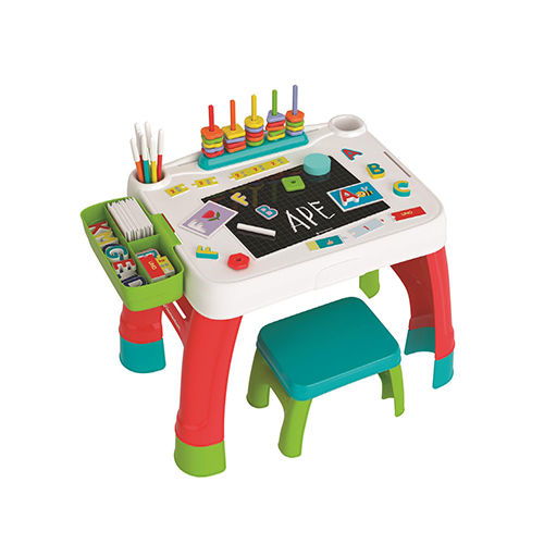 Un tavolo evolutivo ricco di attività educative progressive tipiche delletà prescolare. Nel kit sono inclusi uno sgabello, 4 tacchetti per regolare laltezza delle gambe, accessori in plastica per riporre il materiale di gioco, tessere, puzzle e un abaco con 25 forme colorate.